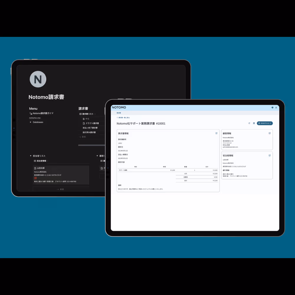 スモールビジネスやフリーランス、副業を始めたあなたへ。Notomo請求書が、請求書作成を簡単に実現。使いやすくカスタマイズ性の高いNotionテンプレートを購入いただくと、Notomoが連携してPDF出力などのサービスが無料で使えます。 Notomo請求書は、Notionに記入した情報をPDFの請求書として簡単に出力できます。 ✔ 顧客管理 ✔ 自社担当者 ✔ 消費税を自動で計算✔ 請求項目管理 ✔ 支払状況をトラッキング ✔ PDFに簡単出力 テンプレートについての詳細はこちらをチェック