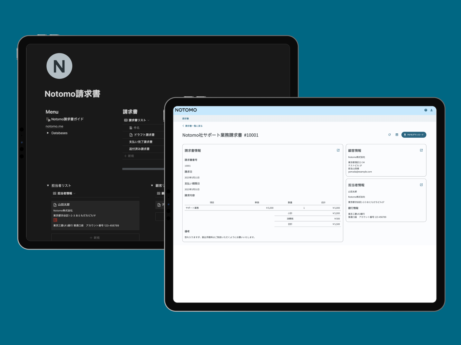 スモールビジネスやフリーランス、副業を始めたあなたへ。Notomo請求書が、請求書作成を簡単に実現。使いやすくカスタマイズ性の高いNotionテンプレートを購入いただくと、Notomoが連携してPDF出力などのサービスが無料で使えます。 Notomo請求書は、Notionに記入した情報をPDFの請求書として簡単に出力できます。 ✔ 顧客管理 ✔ 自社担当者 ✔ 消費税を自動で計算✔ 請求項目管理 ✔ 支払状況をトラッキング ✔ PDFに簡単出力 テンプレートについての詳細はこちらをチェック
