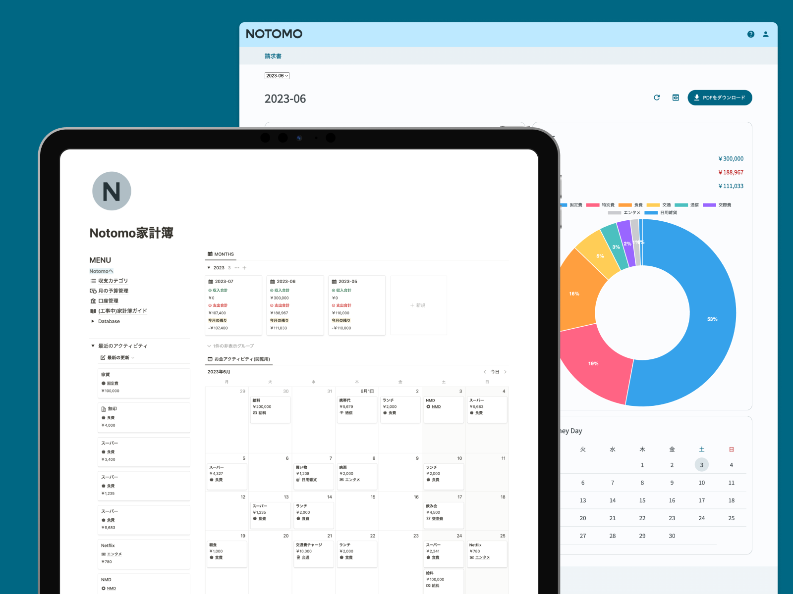 Notomo家計簿は、あなたのライフスタイルに合わせてカスタマイズでき、簡単に楽しく収入と支出を記録できます。より効率的に予算管理と節約をし、夢や目標を実現するためにお金を味方につけましょう! NotionとNotomoが連携して、家計の振り返りや、PDF出力ができます。